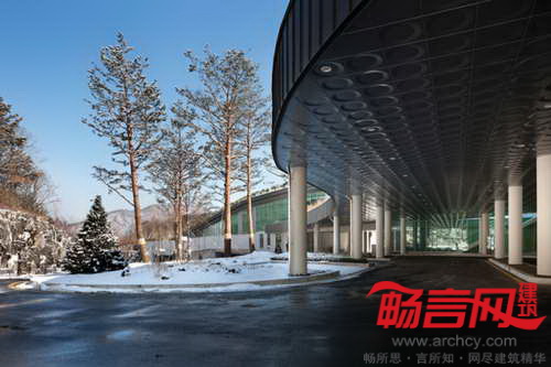 为了克服公众的消极反映,陵园设计师试图避免“矗立”的建筑形式。相反,公园呈现出所谓的“场景艺术”,一系列流畅的建筑形式和主题融入了现有的地形环境。公园正中的凹陷处有一个庭院,周围是进行祭奠仪式的空间,与之相隔数米的地方是山脊和轨道。倚靠庭院而建的两层火葬场建筑的屋顶造型灵感来自花瓣的排布方式,建筑和庭院之间有一个水池。