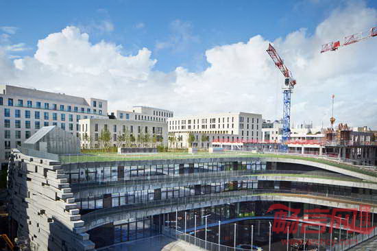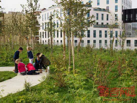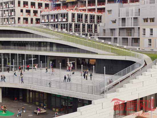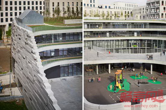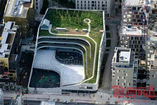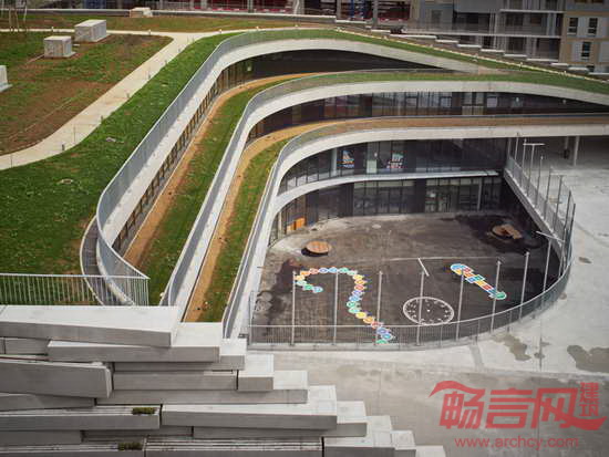 Chartier Dalix建筑事务所在巴黎西面郊区完成了一所小学的设计工作。这所小学构想为“空中景观”,设有屋顶绿化,将自然环境引入城市肌理中。建筑方案包含两个成分:拥有18间教室的学校以及面向当地居民的体育设施。公共体育馆高度12米,教育空间主要位于一层和二层。