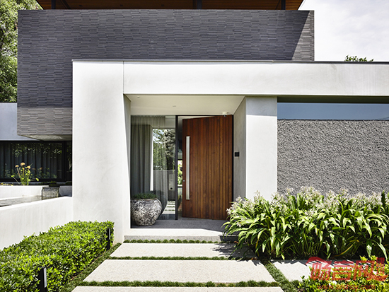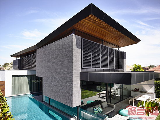 Bungalow Court位于澳大利亚布莱顿市郊外一处枝繁叶茂的小巷尽头,从远处望去,首先映入眼帘的是这座房子风筝形状的屋顶。屋顶仿佛没有支撑一样悬在空中,仅有下方狭窄的水平玻璃立面将其与房子连接起来。