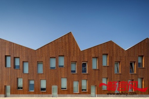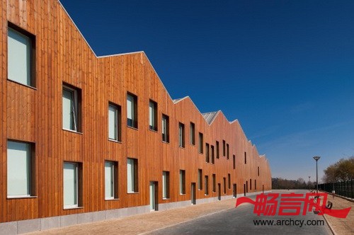 建筑的最顶端是一个双面的、波浪形的屋顶,但是每个波浪的起伏度都不同,这是建筑师刻意设计的,用以让它与幕墙相得益彰,并传达一种运动的理念。波浪形的屋顶与建筑的窗户和开口一起,共同形成了一种城市空中轮廓线的效果。这也就是说,非常有节奏感的不只体现在幕墙的开口的布置上,它同时也反映在屋顶的设计上,它们美化了建筑立体化的外形,这样,不仅突出了学校与众不同的外形设计,也传递出一种童趣的设计理念,同时还呈现给学生和老师们一个极具内在价值的建筑。室内空间的特点和氛围不仅与窗户设置的节奏性和屋顶波浪形设计相互呼应,凸显出室内外交相辉映的特色,尤其是在不同的空间和感官体验上,无论在教室和走廊里都呈现出这种效果。幕墙使用木板做成,非常美观、独特。