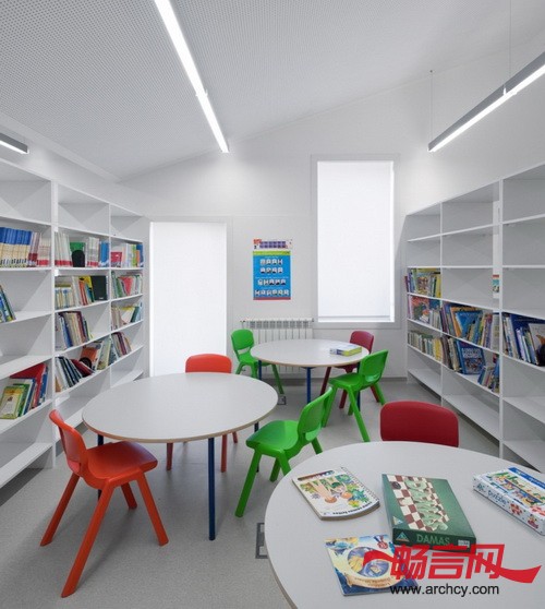 室内的特色就是各种元素的重复使用,例如乙烯基过道、悬挂灯、白色喷漆的MDF一处和们,这保证了室内的明亮和整洁,同时,这些材料和布置还保证了孩子们可以在这里可以很好的交流。