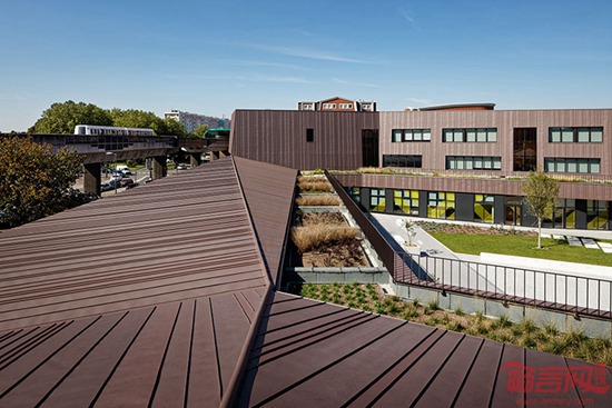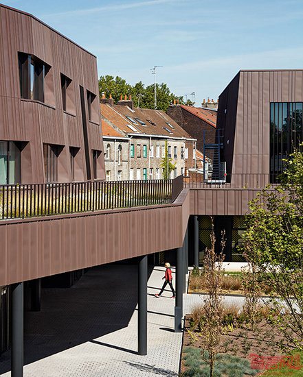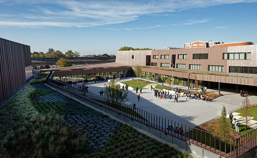 Chartier Dalix建筑事务所设计了位于法国Ivry的Rosalind学校建筑。项目涵盖教学设施和学生宿舍,属于一个大型开发项目的一部分,目标是将地区同巴黎市区连接起来。场地坐落于新建社区边缘,拥有一大片原生态自然景观,设计方案旨在使自然环境同城市景观融合起来。具有角度的副楼围绕两座向南的庭院,后者包含操场,保证每个空间都有户外视野和自然光线。