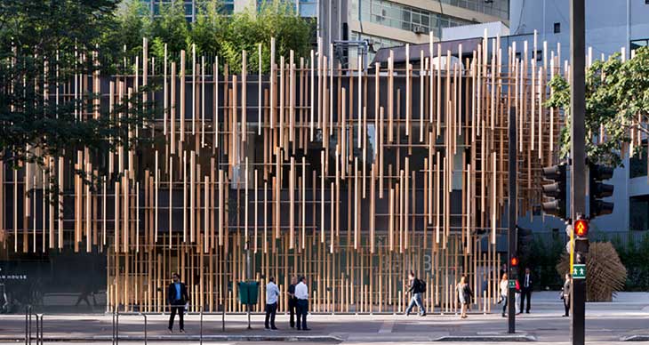 隈研吾完成了“日式住宅”的系列项目。整个项目场地位于三个城市,分别是伦敦,洛杉矶和圣保罗。项目旨在提升世界各地对于日本的理解和欣赏力。首个项目位于巴西,由日本政府委托隈研吾设计,目标是在喧嚣的市中心营造温暖、好客的环境。项目正对街道,临街的一面设有柏树,为安静的庭院提供了入口。