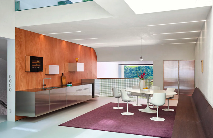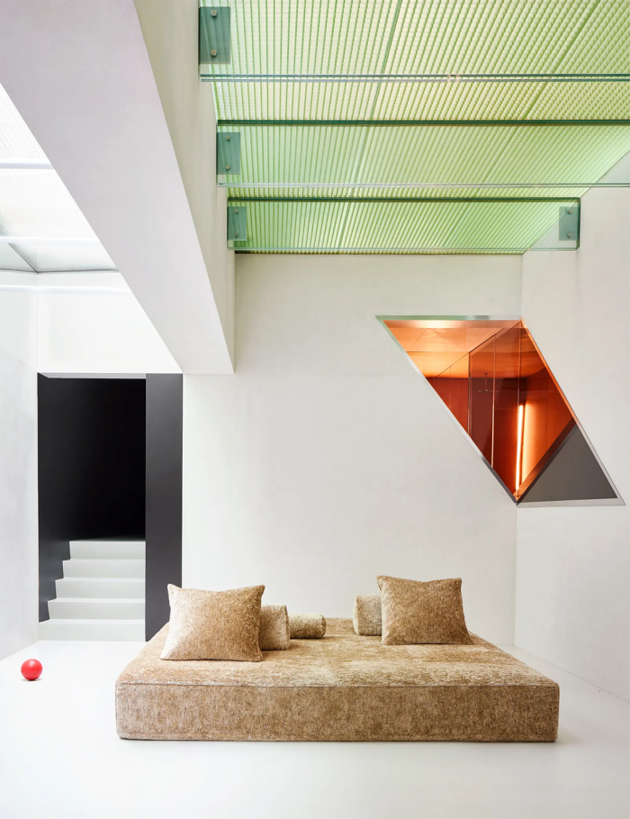 透明的树脂地砖可以让阳光穿过,到达下一层更私密的空间,那里也是一家人日常相聚的场所。桑拿房与客厅和餐厅相邻。