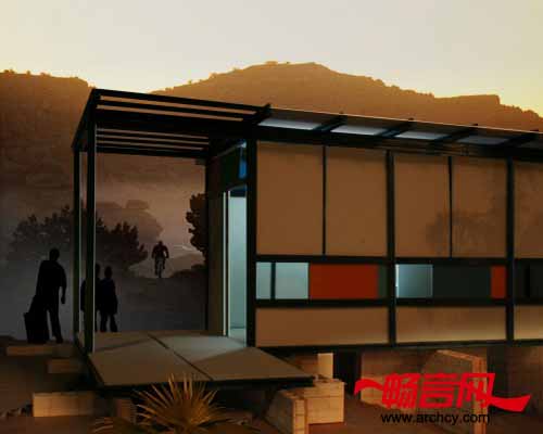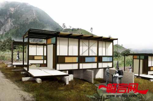 这项工程是为海地灾后重建区域而专门设计的模块式的房屋,它致力于建造一个能够自给自足的住宅小区,并使每个房屋的面积最小化。建筑师计划将这个住宅工程分为四个8 x 8英尺的模块,每一个模块则是一个房屋。设有浴室和厨房的中心区域将室内分为一个卧室和餐厅起居室。第四个模块是一个室外门廊,人们可以在这个区域里进行灵活的功能转换 --- 可以将它建造成各种活动区域,这样就为小区提供了一个多功能的公共场所。由门廊形成的L形区域不只使住宅小区内的各个房屋风格一致,也为每个房屋提供了一个私人花园。