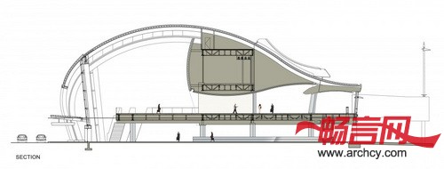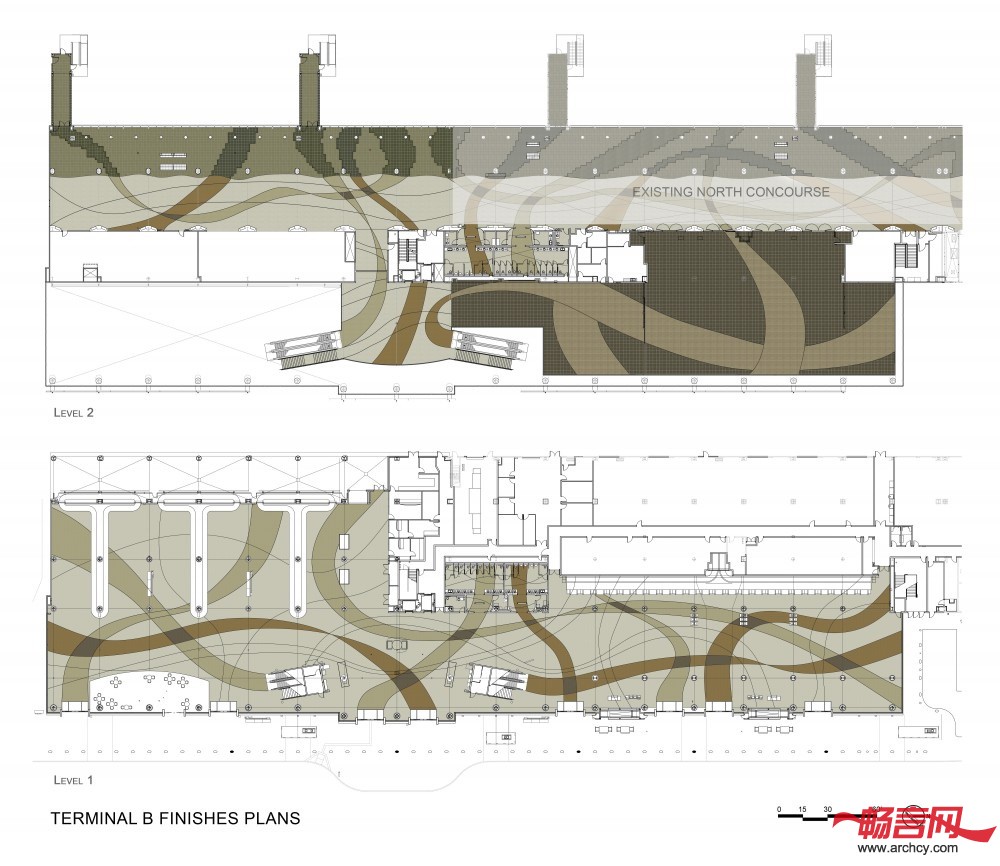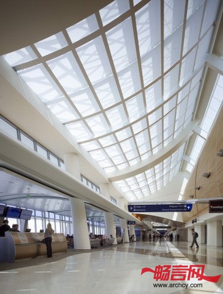 B航站楼里不只室内外都由高科技设计,同时它也是一个非常舒适的地方。玻璃幕墙和打孔的金属板幕墙让阳光洒进室内,而室内倾斜的木质天花板则为售票窗口附近区域和检票口增加一缕暖色。Fentress建筑事务所设计的这个San Jose国际机场B航站楼非常环保,而且为出入境的旅客提供了一个非常清爽舒适的环境。