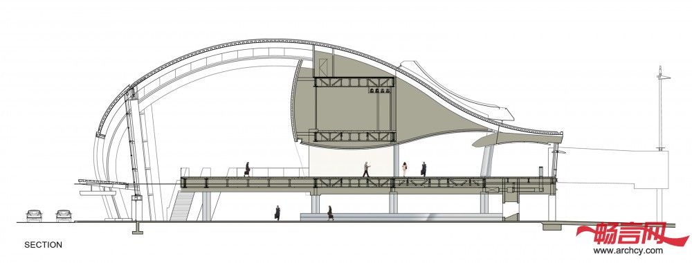 Fentress建筑事务设计出的方案不仅有着漂亮宏伟的外型,而且建筑的抗震性很强,适应加州经常地震这一特点。机场用弧线形的弯梁似的或者打孔的金属板做成幕墙。金属结构包围着也保护着玻璃隧道形的航站楼。Fentress把航站楼设计成光滑的双轮买车形,它的屋顶在地震的时候可以向两侧各移动1英尺。
