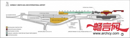 在San Jose机场改造工程中,B航站楼项目非常有挑战性,因为它位于几条车道和水道围成的区域里,建筑地块十分有限。而且,B航站楼开建的时候,机场还在运营,所以,Fentress建筑事务所还要在这样的情况之下进行这个玻璃隧道形航站楼的建设。