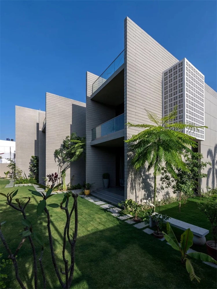 项目位于印度北部城市Luckknow,房屋覆盖着遮阳板,除了遮挡阳光,在一天中产生不同的光照模式,同时可减轻道路交通噪音。由Sanjay Puri Architects设计,项目是六居室住所,位于私人住宅开发区边缘。