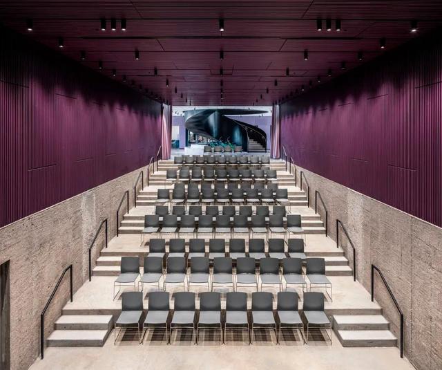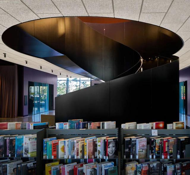 活动中心则有着灵活的礼堂空间和屋顶露台,以此为湖滨公园的广阔景色构筑了观景框架。而建筑师在为市民服务的图书馆建筑和以商业为重心的活动中心建筑之间打造了平衡的空间关系,并在两栋建筑之中都设计了如雕塑般的标志性楼梯。