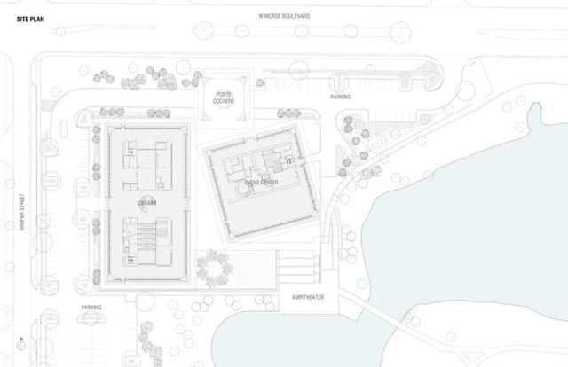 温特帕克图书馆及活动中心“村落”由一个新筑的两层高图书馆、一个带有屋顶露台的活动中心和一个欢迎门廊组成。其中,门廊将把人流从街道上引入公园,并以其设计整合了三栋看似独立的建筑。而三栋单体建筑则以亲生物设计为原则、以玫瑰色调混凝土为主要材料,它们共同伫立在一个凸起的观景台上,为建筑内部的人们展示了门德森湖(Lake Mendsen)如田园诗歌般平和的风景,并在三栋建筑之间打造一了个户外绿色社区空间网络,以此增强了人们与公园健康福祉的联系。