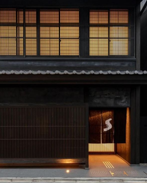 Shinmonzen是一家位于京都祗园的小型酒店,单从街道望去,建筑外立面深色的木格栅到屋面层叠的瓦片,与传统京都联排的建筑毫无二致。然而,当人们走过悬挂“s”字样门帘的入口,便会看到由混凝土和木板格栅围合的走廊,与其外表大径相庭的现代风格扑面而来。