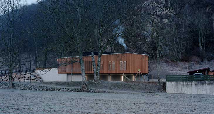 消防员在技术中心工作。建筑的第二个区域隐藏在行政区后面。其黑色外形不仅凸显了木质外立面的典雅,同时让大体量建筑在周边山地环境中脱颖而出。