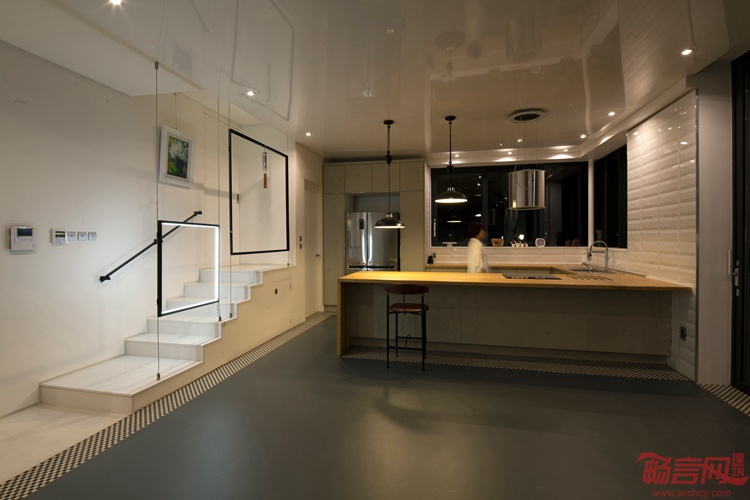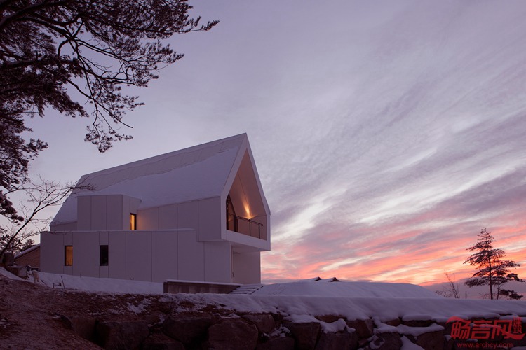 AEV事务所设计了韩国“至简纯白”住宅工作室。项目位于Sokcho,私人住宅拥有简单的轮廓,同周边的Seorak山的葱茏形态构成对照。在现代艺术和建筑中,白色被赋予了多层面的意义。许多场合中,白色同时也是纯净、抽象、简约和清晰的象征。白色色度也在许多非再现艺术中被反复检验,1920年代,白色这一色彩也成为建筑学新时期的体现。理查德·迈耶可能是在其建筑中坚持采用白色格栅外立面的最著名的建筑师,他至今仍在作品中坚持这一风格。在法国AEV事务所查看了项目场地中的壮观山峰和色彩后,他们采用了事宜的建筑设计手法,构想出简单形状组合。这种去材料化通过使用丙烯酸树脂板实现,突出了自然环境形状和色彩的多样性。白色也占据了室内起居室,使得室外景观能左右房间的氛围。