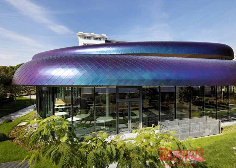 法国Agence Jouin Manku建筑事务所设计了巴黎郊外办公园区中的一座办公楼。建筑拥有弧形亮面顶部,宛如盘桓着一对闪耀着龙鳞的游龙。事务所受托为法国最为古老的物业公司Socieete Fonciere Lyonnaise公司建造翼形办公空间。该公司的办公地点是塞纳河岸一座1920年代厂房改造建筑。项目名为In/Out,新建结构包含围绕一座管状混凝土楼的弧形三层建筑。