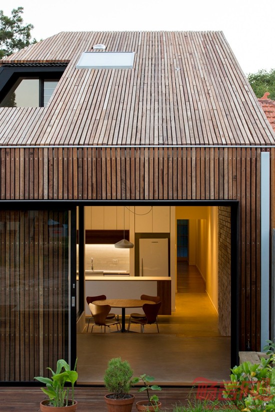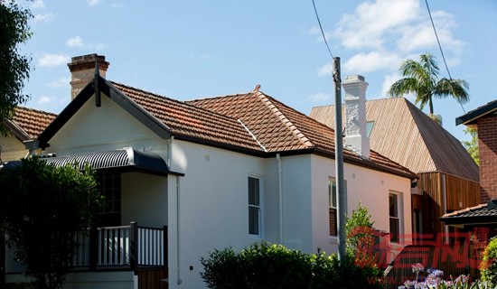 在澳大利亚悉尼市北部沿海地区,有一座建于两战之间年代的半独立式房子,坐落在许多高低起伏的瓦片屋顶和铁皮屋顶房子之间。建筑师事务所Scale Architecture对这座房子进行了扩建,新增了一栋木板包覆的现代二层小楼。