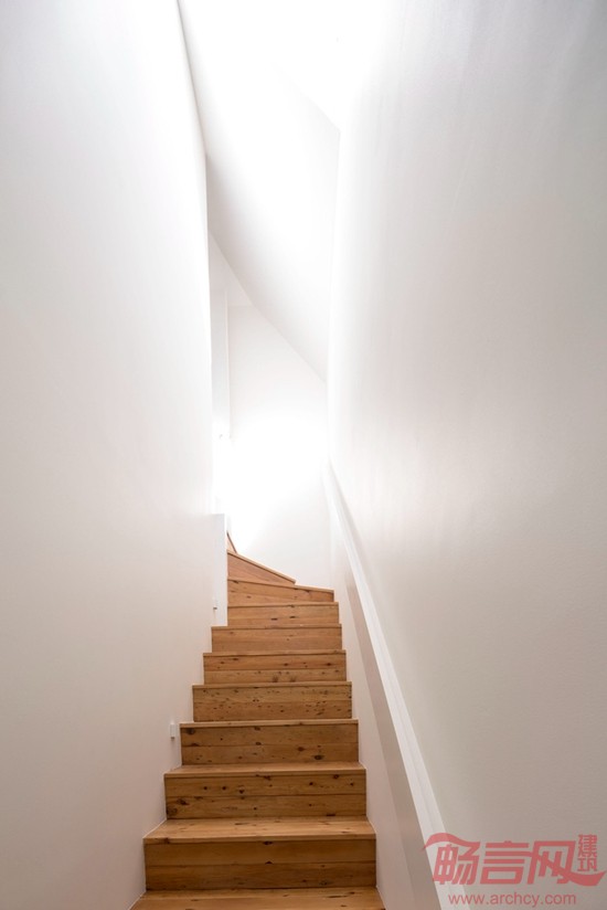 建筑师没有对原有的半独立式房子作任何改动,其后部的新建小楼有一个不寻常的斜屋顶——屋顶的较大一部分被“切掉”了,这样日光能够更深地照进屋子里,整个户型呈“C”字形,中间留下一个天井。