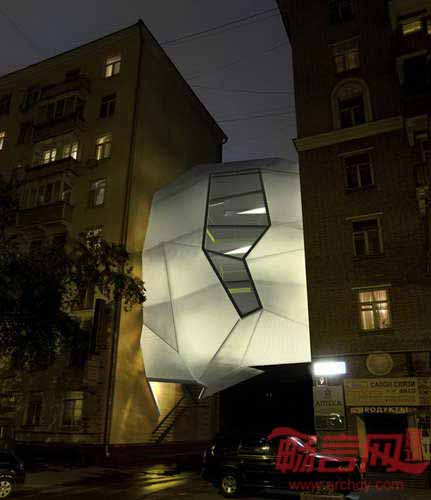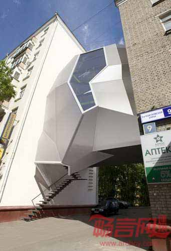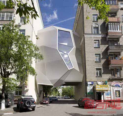 莫斯科Za Bor建筑公司设计了一项新奇的当代建筑,项目探索了城市填充,在两座现有建筑之间添加了新建房屋。作为欧洲最大城市,莫斯科极其缺乏具有创意感的办公空间,此外高楼间不适宜居住的间隔空间却很多。建筑是三层的悬浮结构,由轻型钢结构支撑,并固定在邻近实心墙上,将下方的人行道空出,方便居民通行。