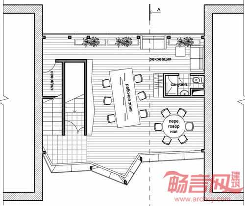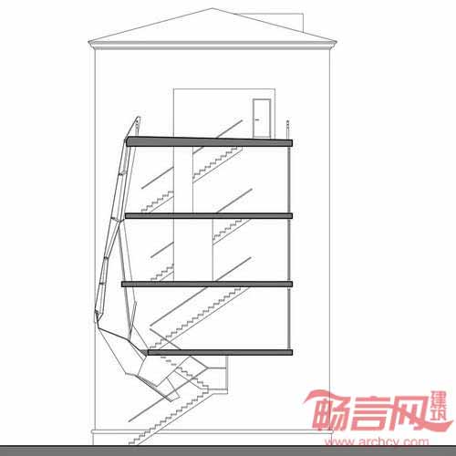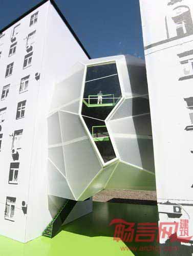 建筑采用了模块式活动地板系统,方便将来的重新设计和需要变更,墙边使用了多边形聚碳酸脂板,与周边方正的建筑形成了对照。建筑的大扇窗户为各楼层提供了充足的光照和良好视野,而遮蔽立面形成了平整幕墙。该项目设计成功地展示了如何改造城市不易利用的空间,在不对已有建筑造成影响的前提下,创建动感且具有适应力的新建筑。