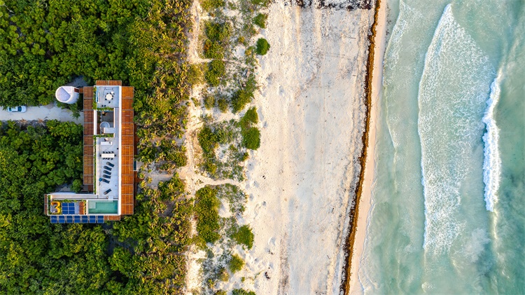 保护区距离Tulum约一小时车程,分为三个区域,分别有不同的活动限制。Productora工作室将住宅设计成L形,位于过渡区的海滨地段,以生态旅游度假住宅开发。