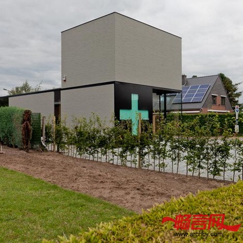 住宅的前面与旧农场的界限一致,这样就将药店的建设与现有环境融合起来。
