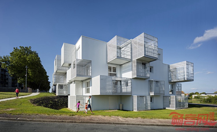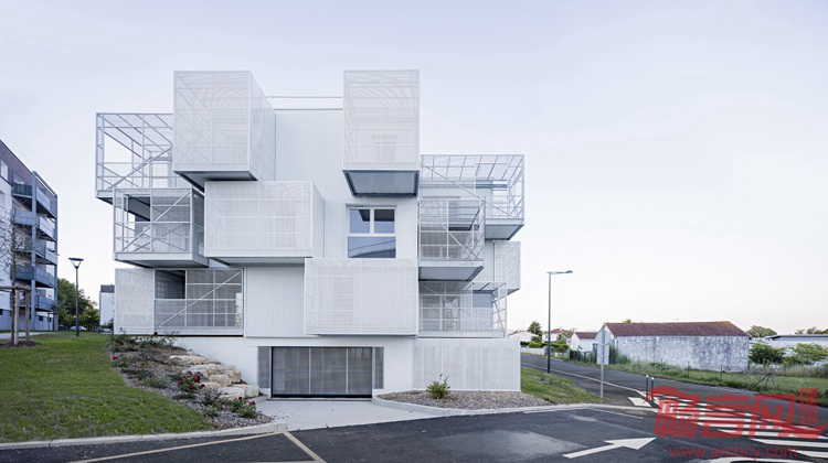 Poggi + More设计了法国Saintes社会住宅。建筑一面带有白色的方形阳台,让其看上去如同一系列堆叠的不规则方体。这个名为白云的项目面积达1886平米,涵盖30套住宅。通过金属格栅阳台的设计,设计师希望达到增添户外空间的目的。
