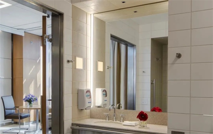 带有住宅特色的浴室包含全尺寸的淋浴和盥洗室,还有灵活布局的访客座位,让患者和他们的家人在整个治疗过程中感受支持和尊重。