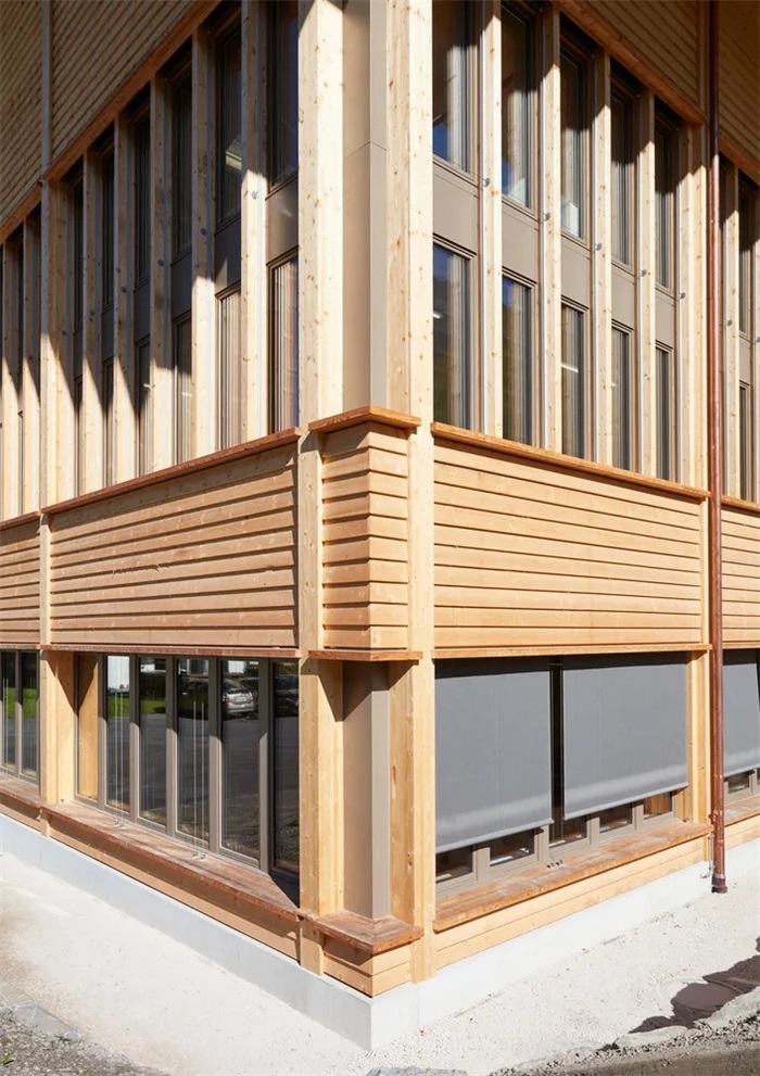 70多米长的立面的设计突出了了大柱子的间距。它们显然是常规分隔,并通过纤细的窗户进一步分隔,并以垂直的木制风撑进一步的在同一水平上分割。落叶松木板构筑并加强了各个细分区域,粗糙的斜纹云杉式挡风玻璃使立面更加整体化。