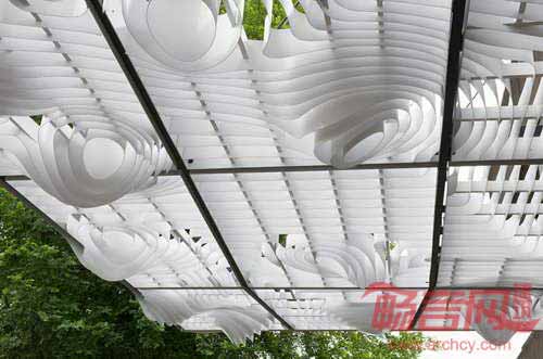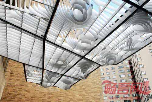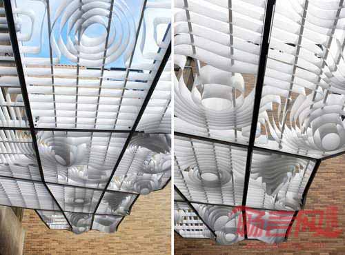 FAULDERS工作室为波特兰州立大学科研中心设计了“Entrium薄云装置”,成为建筑主入口的遮阳结构。这一顶棚设施采用铝型材,方便光线透过,赋予明亮开放的下方空间。