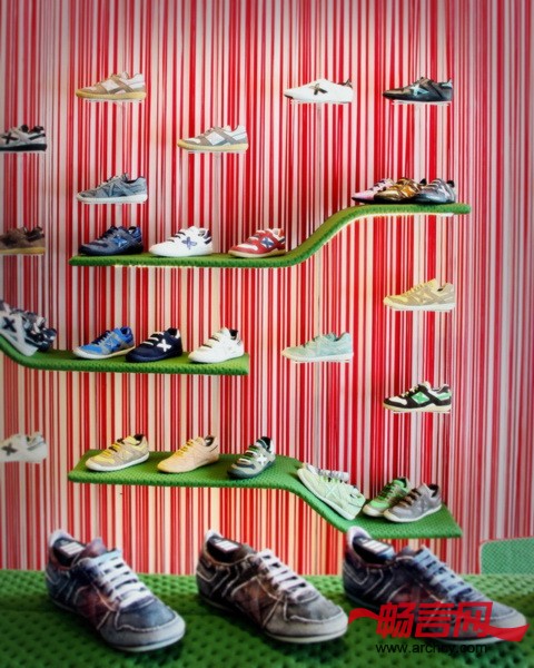 为了让店里看起来更加清新,DEAR DESIGN用绿色元素装扮收银台、鞋架、沙发和墙壁,这让人们想起爱尔兰翠绿的小山。此外,店里还使用LED灯光,这能减少能源消耗,这与MUNICH品牌的环保理念相互一致。