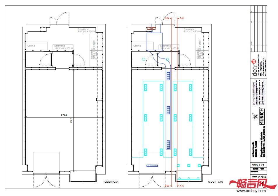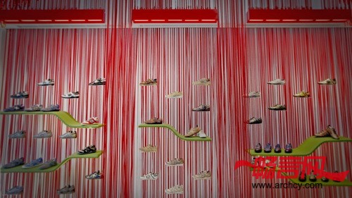 DEAR DESIGN建筑事务所是这个项目的设计方,店面共60平米,它与其它MUNICH鞋店的设计内涵一样:体现艺术感。室内给人一种温暖舒适的感觉,让顾客感觉宾至如归。为了达到这种效果,DEAR DESIGN使用了非常简单、日常的材料进行装饰,例如防火的MUNICH鞋带等等。6,700米长的红色鞋带缠绕、装饰了整个鞋店。鞋带首先覆盖了整个天花板,然后像摆锤一样垂下来。