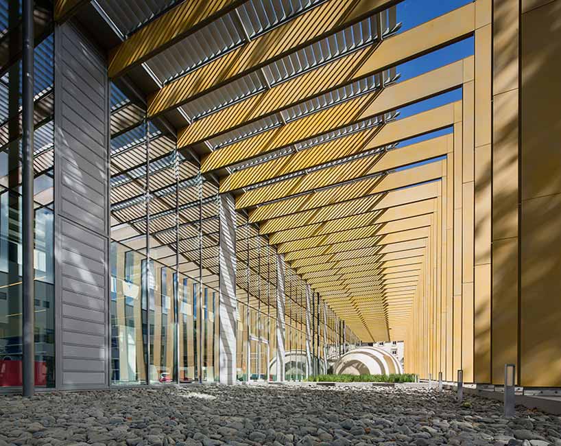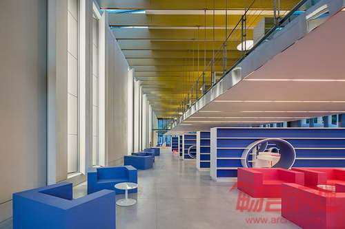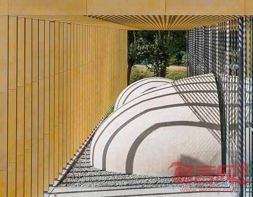 OPUS 5建筑事务所设计了位于法国西部蓬蒂维(Pontivy)的媒体图书馆项目。建筑有三个朝向,提供了不同的视野环境。作为远离都市喧嚣之地,图书馆为读者提供了祥和安宁的阅读环境,读者可以独自阅读,或者参加团体活动。建筑包含三个层次,自然光照照射进各个区域,以别致的光影为空间增添了生趣。最外层围护结构是钢制叶片,不仅模糊了室内外界限,还为读者带来安全宁静的感受。向内一层是玻璃立方体,包裹了大厅和附近的阅览区,最内层是不透明结构,内部是作为建筑“宝库”的储存室。