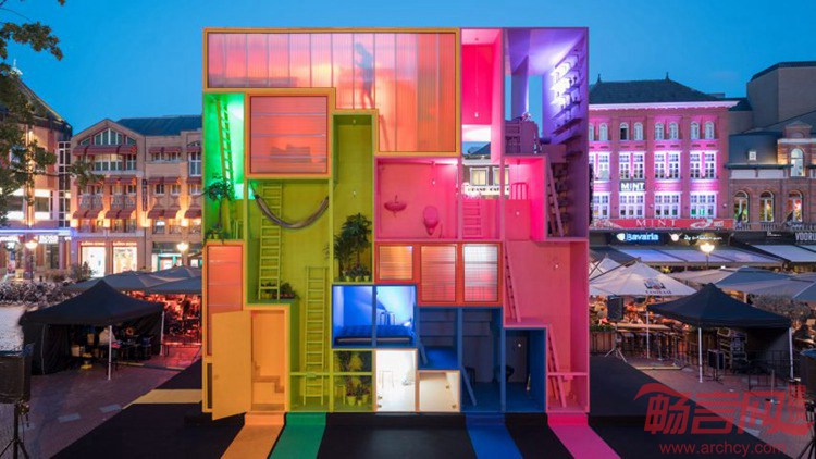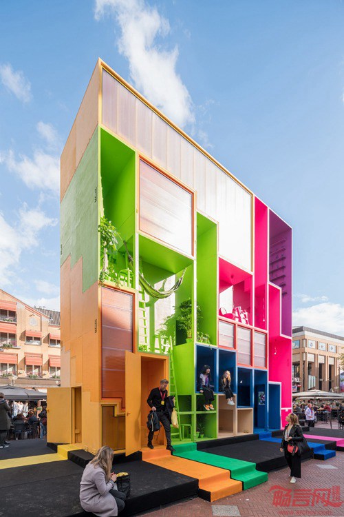 荷兰MVRDV事务所设计了一座五彩斑斓的未来主义酒店,包含九套客房,可被放置在不同的环境中。2017年埃因霍温设计周期间,事务所呈现出Wego概念方案,可适应未来住户的多种需求,住户可以是家庭,学生或者是难民。每座多彩住宅均面向不同的住户,其中包括活跃的带有格子的紫色空间,荧光绿包含梯子和吊床的单元,桃红色多层复式和亮黄阁楼空间。