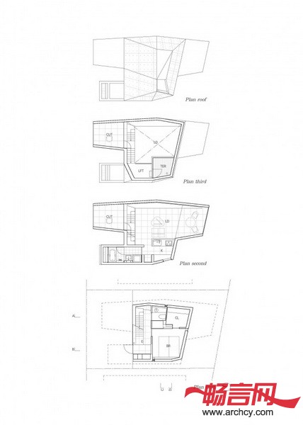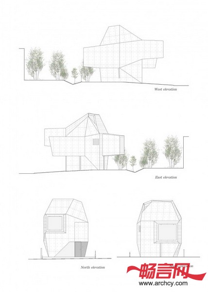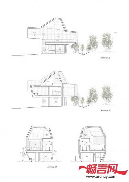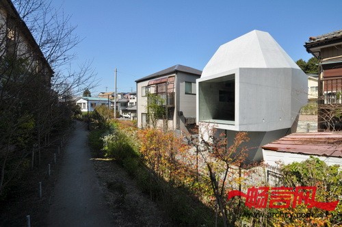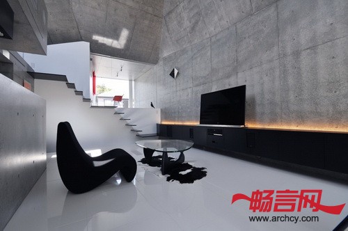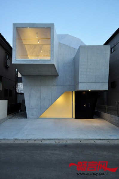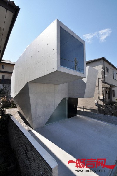 建筑地块在两个高地之间,这里的土壤十分柔软,所以,要在钢筋混凝土结构下面加一些桩子,用以固定和支撑整个结构。为了减少成本,设计师让住宅与地面的接触面积尽量达到最小,这样就可以少节省一些桩子。同时,上部的结构悬臂出来。各个空间的墙壁和屋顶形成了一个三维的倾斜平面,应力传递就得到了合理的处理,也给住宅一个十分特别的外形。