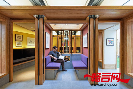 公共房间的两侧分别是一个壁炉和一间厨房,在这个房间的前方有一个私人会议室和一间治疗室。