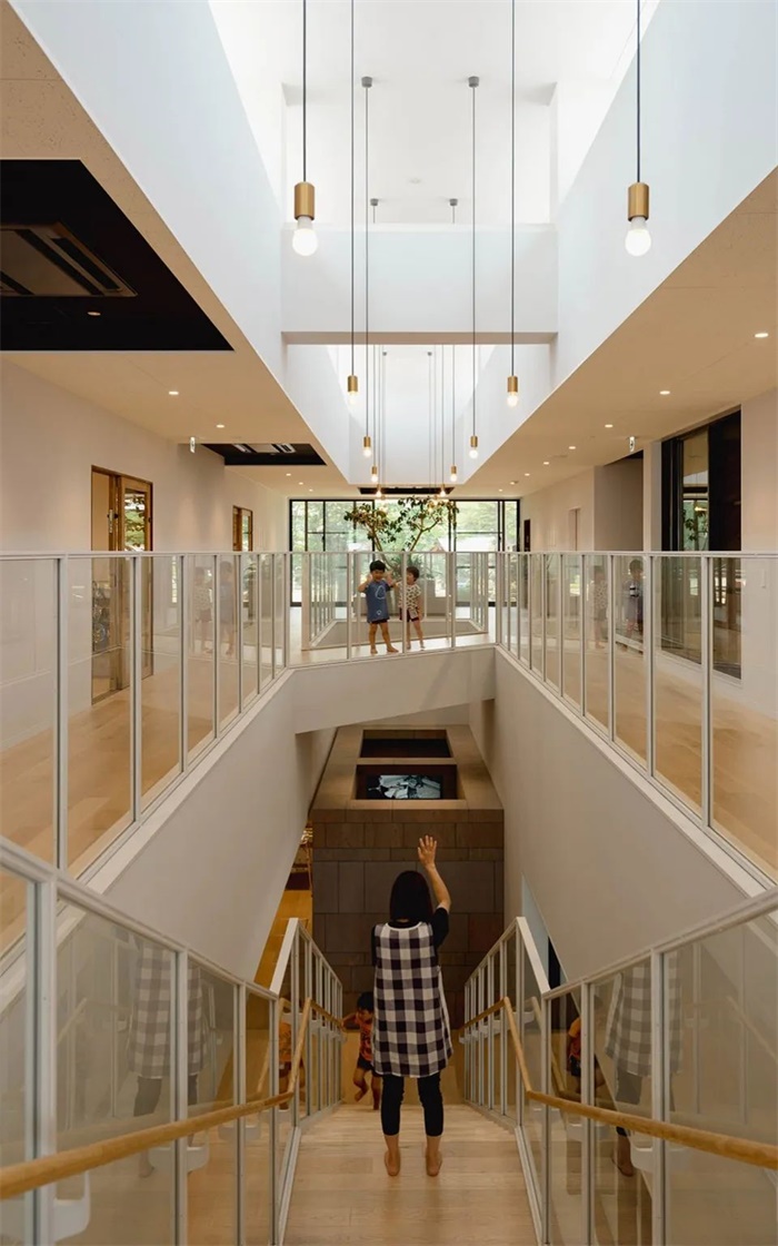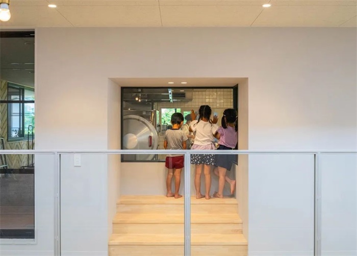 考虑到当地的冬天容易积雪,希望将当地雪量丰富的外部环境和孩子们的游戏和学习相结合,为孩子们营造一个更丰富的游戏环境。园舍被露台一圈环绕,还设计了一个下大雪后的积雪能玩滑雪,其他时期能玩滑草的滑坡。设置了不受季节和天气影响能开展各种室外游戏,灵活应对各种使用目的宽阔的一楼架空空间。四季交替孩子们都能在这里和外部环境共生,挑战各种各样的游戏。