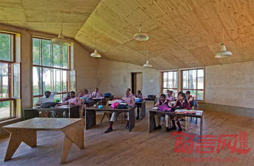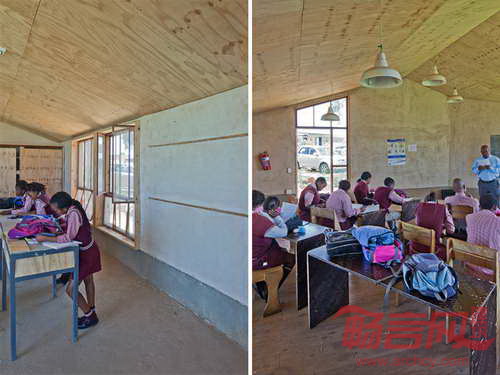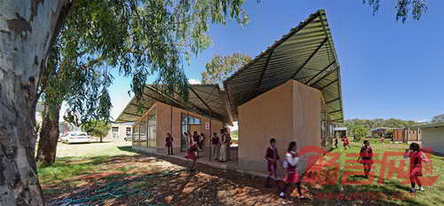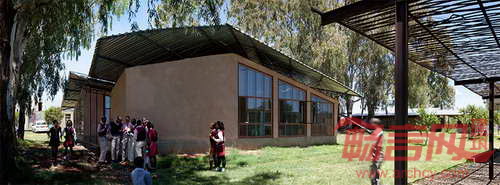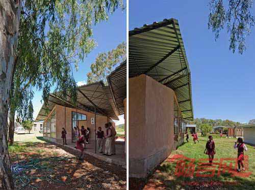 最新项目是Ithuba科学中心,包含两个生物和化学教室、多功能大厅、必要的支持设施,项目设计人员是来自德国亚琛RWTH大学的大学生。设计概念采取常规矩形占地平面,设置一个中央公共走廊,使折叠屋顶下方变成两栋具有棱角的建筑物。浇筑混凝土上方建造了一个钢框架结构,注入稻草包和粘土混合物,这种德国传统工艺能创造高度保温的巨大墙体。