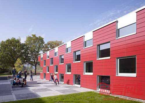 外立面材料灵感来自1970年代建造的现有学校建筑,这批房屋拥有红色的砖墙立面。设计师认为近似的当代材料就是30厘米的陶瓷板材。