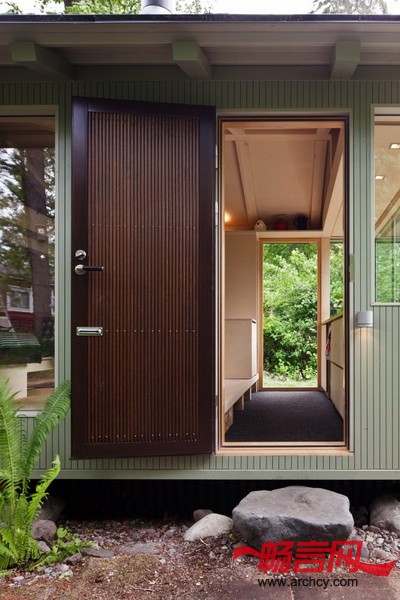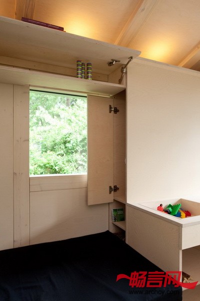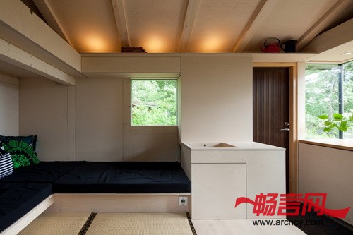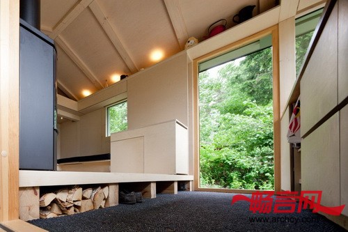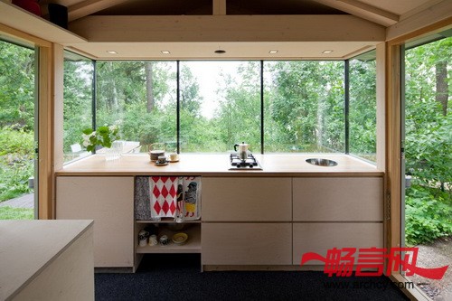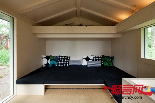 在Palva家庭农舍里的时候,你不会感觉身处在城市里。去往农舍的路上有一个小沙滩,从农舍里面就能看到外面的大海。建造这个农舍的初衷无疑就是让这个家庭可以长时间的在这里度过:其中的一个标志就是可以将农舍的厨房转化为孩子的学习空间。“家里的每一个人随时都可以自己来这里放松自己,接近大自然。” Jussi Palva说。因为这个农舍只有14平米,但是却要给四口之家主,所以,要很精确的分隔空间。它被分成了入口和厨房区域,在这里有一个日式的小台阶,从这里就能到达起居室和卧室。在设计的时候,建筑师非常细心的研究了渡船和活动房屋的空间设计,然后将同样的方法适用在这个14平米的、里面放有家具的小屋上。靠近后墙的沙发可以方便的转化成可供三个人睡觉的床,第四个床位则在阁楼上。内嵌的壁橱和楼梯下面则作为储存区域。