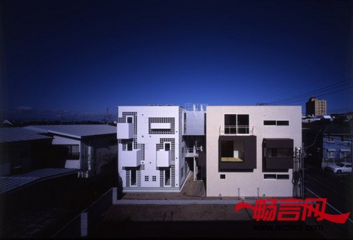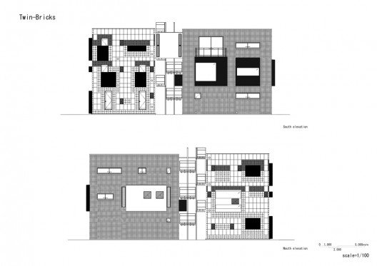 连体砖墙住宅包括两个翼楼 --- 一座5个单元的出租楼房和一个主人自己的双户住宅。住宅位于一个非常安静的住宅区,距东京只有20分钟的火车路程。为了满足住宅主人爱好收集车辆的需要,所以主人翼楼(RC翼楼)比出租翼楼(S翼楼)要更加靠近街道一些。S翼楼使用砂加气混凝土(ALC)和玻璃共同作为幕墙。