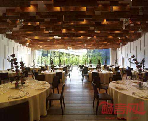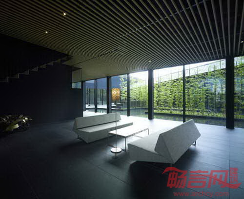 隈研吾事务所将酒店设计成一个“冷峻静谧的环境”,竹林景观和水景池为场地中央玻璃结婚礼堂提供了景观背景。