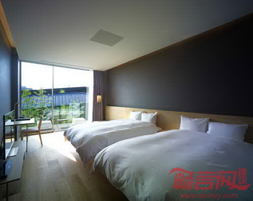中央庭院各侧面分别是餐厅和活动室,客房位于酒店一层。