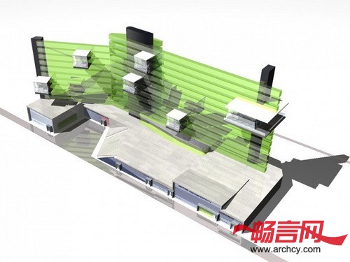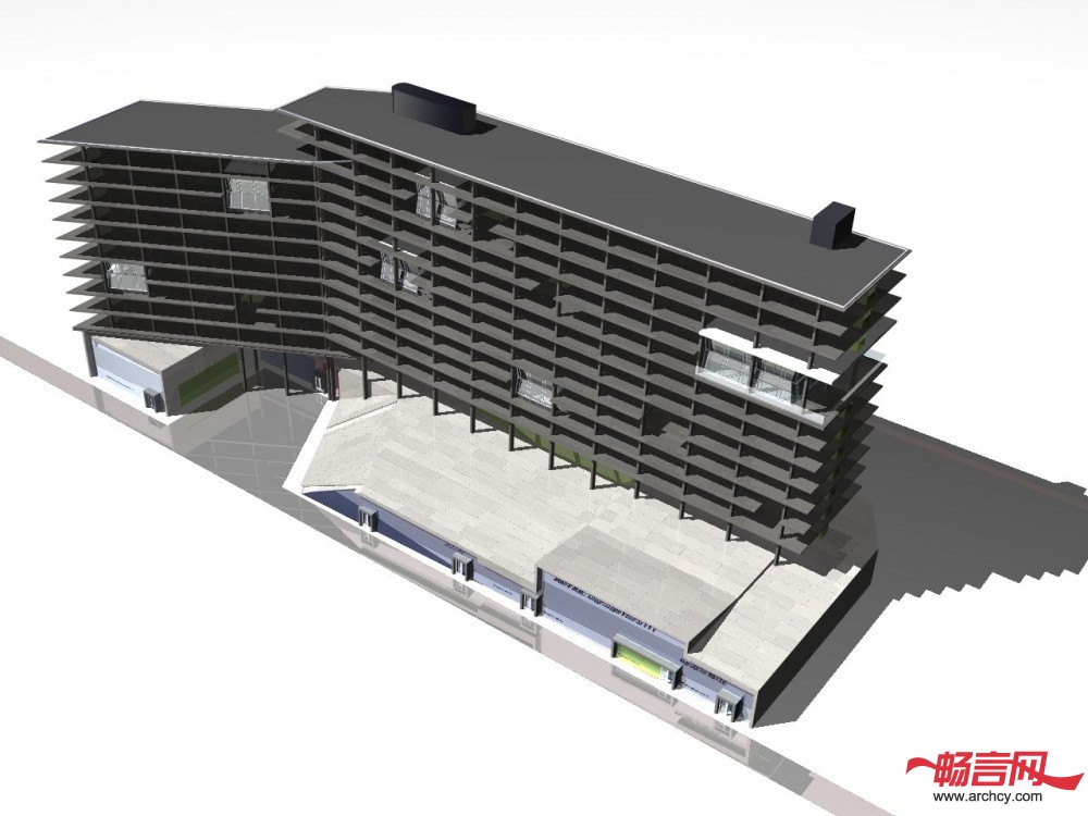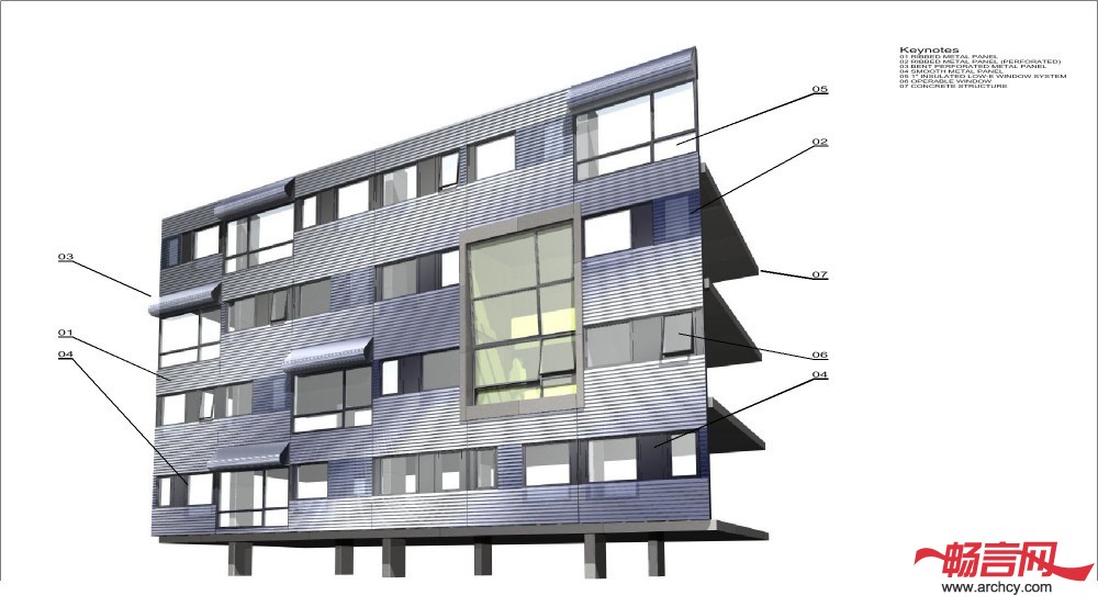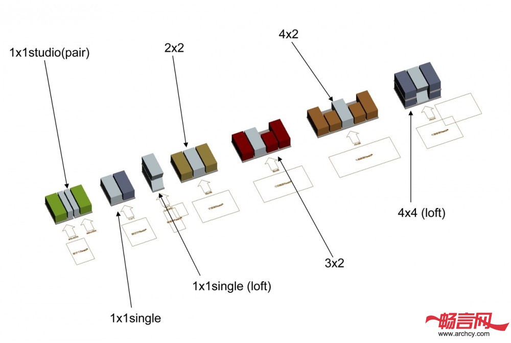弧形公寓的模块化设计风格参考了宿舍楼单元设计的建造风格,但没有宿舍楼线条硬直的特征。每个公寓会安排一到四间卧室,并且每个楼层的安排都不相同。这个灵活的规划将带有一间浴室的公寓同带有四间浴室的公寓结合起来,创造了无规则的接合点,从而获得了一种意想不到的效果。这些接合点位于大楼的内部,从建筑外部透过嵌在墙上的窗户便可以看到它们,它们统一采用白色的带状幕墙装饰,围绕着整座大楼的结构分布。