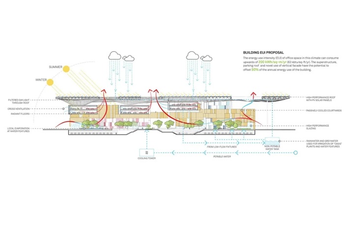目前,有多达5000人在MEWA综合大楼工作。高架花园可通往室外空间并欣赏风景,而花园则被设计为示范场所,并带有阴凉的可食用花园和其他室外区域。屋顶顶篷提供的阴影加上树木,观赏性植物和交叉通风的目的是旨在为一年中的许多时间提供室外气候。