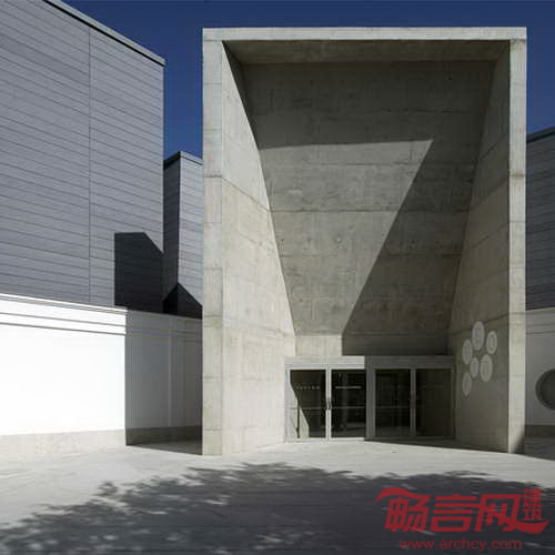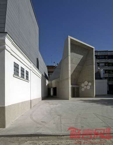 设计师Matilde del Amo将西班牙西部Navolmoral一座行会厅改造成一个具有巨大混凝土入口的剧场。L型行会厅一侧容纳了剧场礼堂,另一侧成为接待厅。项目去除了一个连接储存空间的中庭,添加了具有玻璃门的巨大混凝土入口。