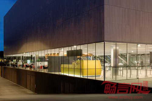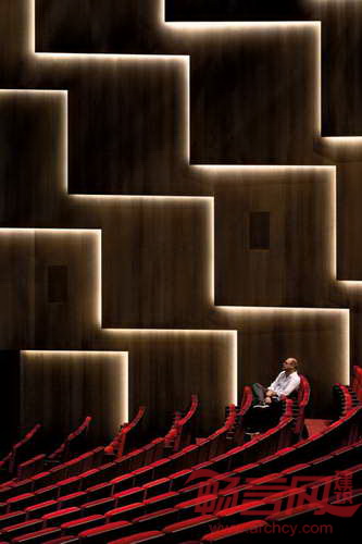 蓝色缎带外观的城市剧场位于场地右侧,外墙使用了竖直条纹的玻璃幕墙。场地左侧是优雅的白色石材影院多功能建筑。