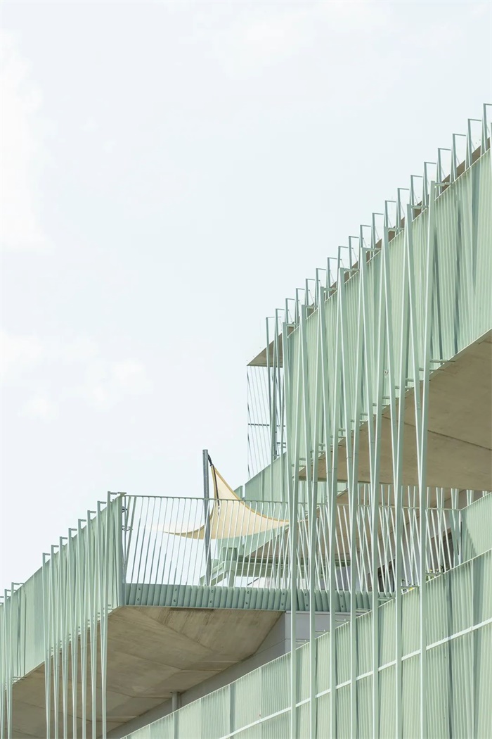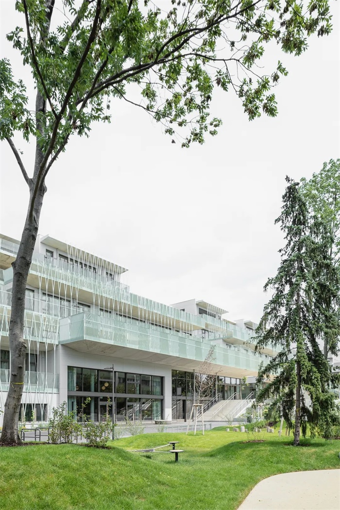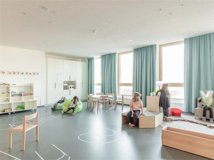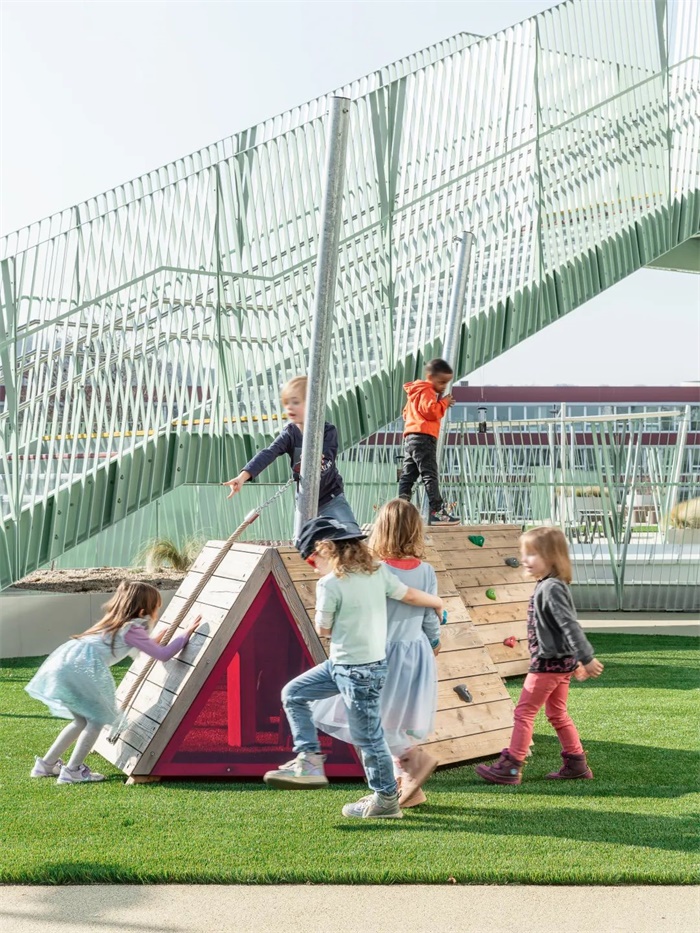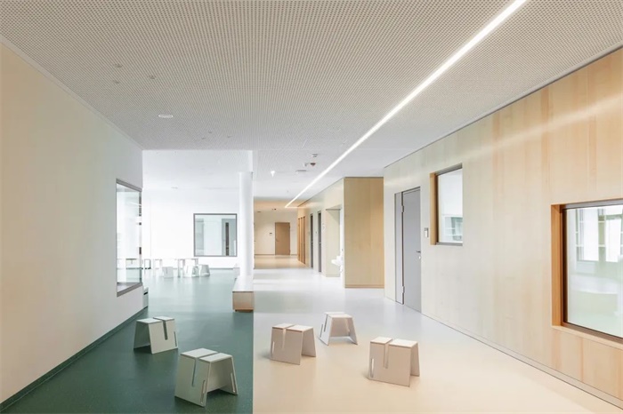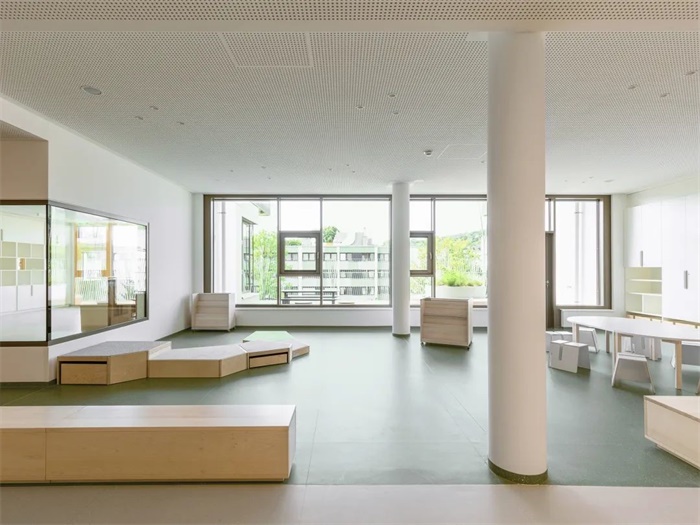 这座简洁、独特的学校拥有南向的阶梯式建筑。每两层为一个层级,每个层级都拥有宽敞的露台直接连通教室和带有大窗户的休闲空间。阶梯状的南立面、底层的长廊和室外操场共同形成了一个经过精心设计色景观,与之相对的是北立面设置小窗户,以此避免来自北侧铁路的噪音。设计通过将中学部分建筑体量与铁路平行布置,在南侧入口大厅和长廊周围为儿童和邻居创造了一个安静安全的区域。