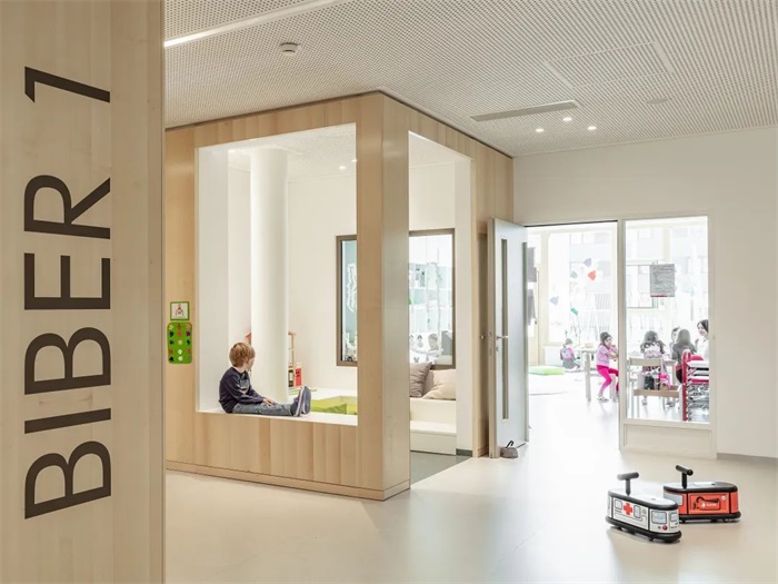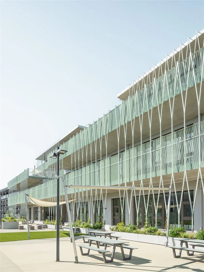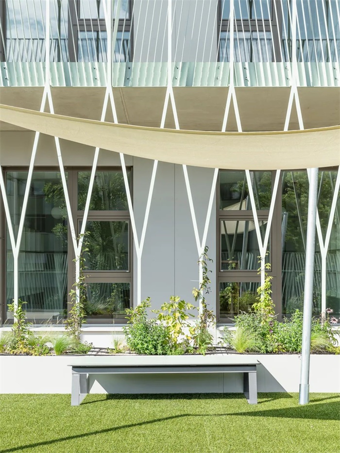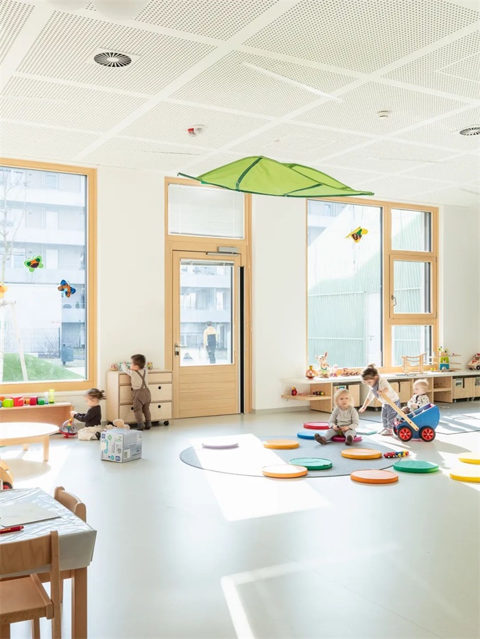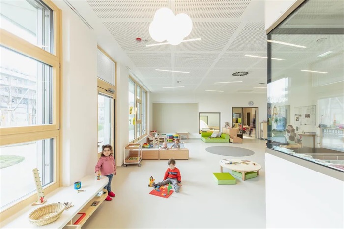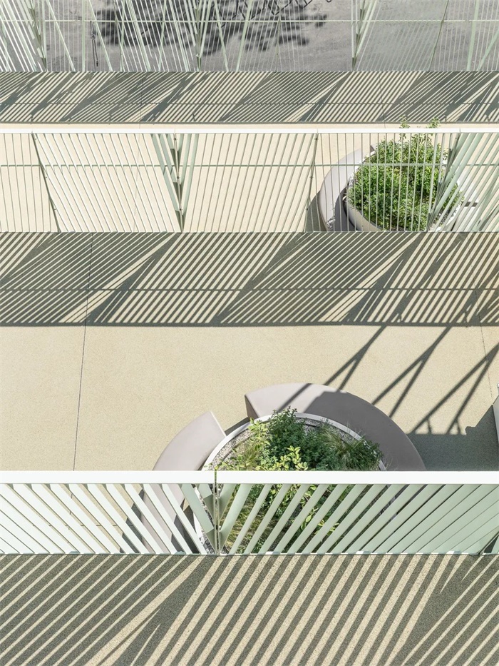 这座简洁、独特的学校拥有南向的阶梯式建筑。每两层为一个层级,每个层级都拥有宽敞的露台直接连通教室和带有大窗户的休闲空间。阶梯状的南立面、底层的长廊和室外操场共同形成了一个经过精心设计色景观,与之相对的是北立面设置小窗户,以此避免来自北侧铁路的噪音。设计通过将中学部分建筑体量与铁路平行布置,在南侧入口大厅和长廊周围为儿童和邻居创造了一个安静安全的区域。