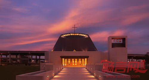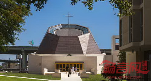 独特几何造型的教堂位于学生中心的原址,该中心在卡特里娜飓风中受到损毁。现在,这座20米高、容纳430人做礼拜的教堂体现了大学的灵魂。教堂比地面高出1.2米,运用了300米的坡面和分区前厅。