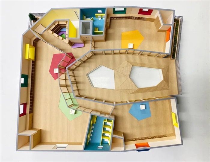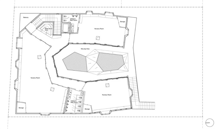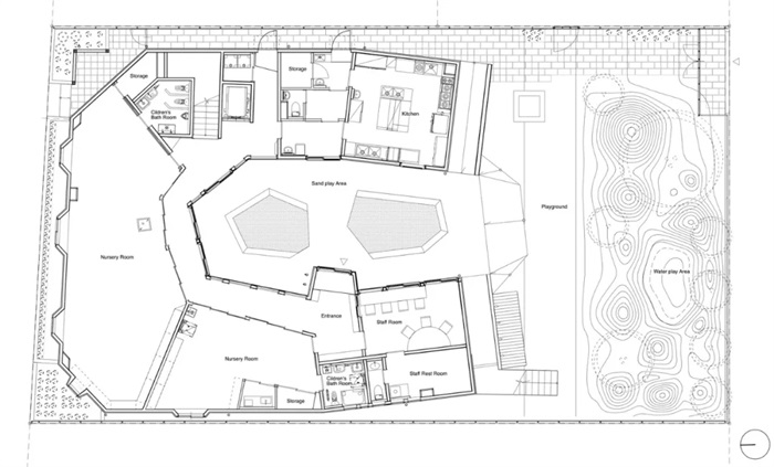项目设置了两个花园,外花园完全脱离建筑,内花园半室内半室外设置。当在外花园玩耍时,内、外花园的边界实际上变得很模糊。当在内花园玩耍时,室内外空间仿佛融合在一起。内花园与室内房间相连,内部空间的视野因此变得开阔。在两个花园里孩子们一起玩耍共度时光,从事不同的活动,如果他们乐意的话随时可以在室内外穿梭,有时不同年龄段的孩子也可以结交成朋友。内花园成为一个模糊内外边界的空间。